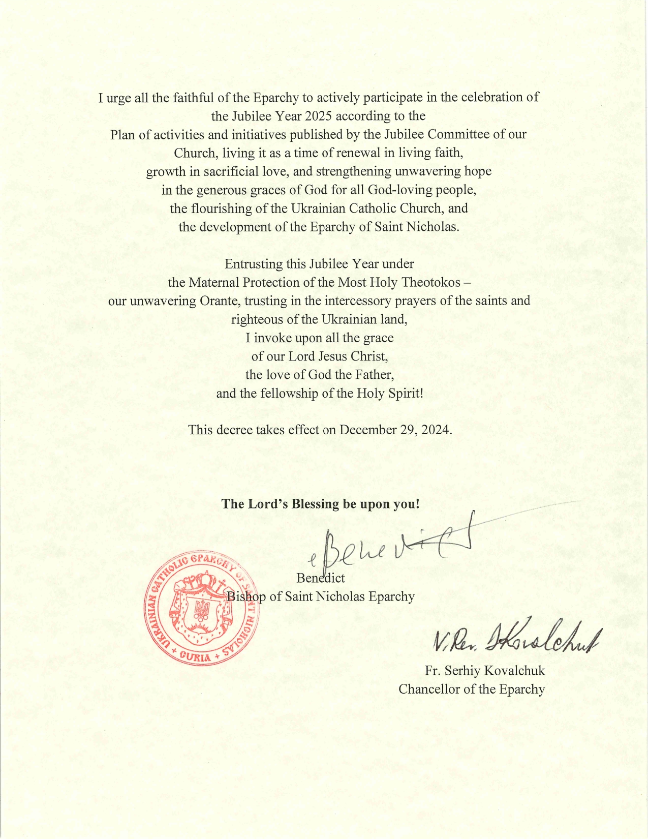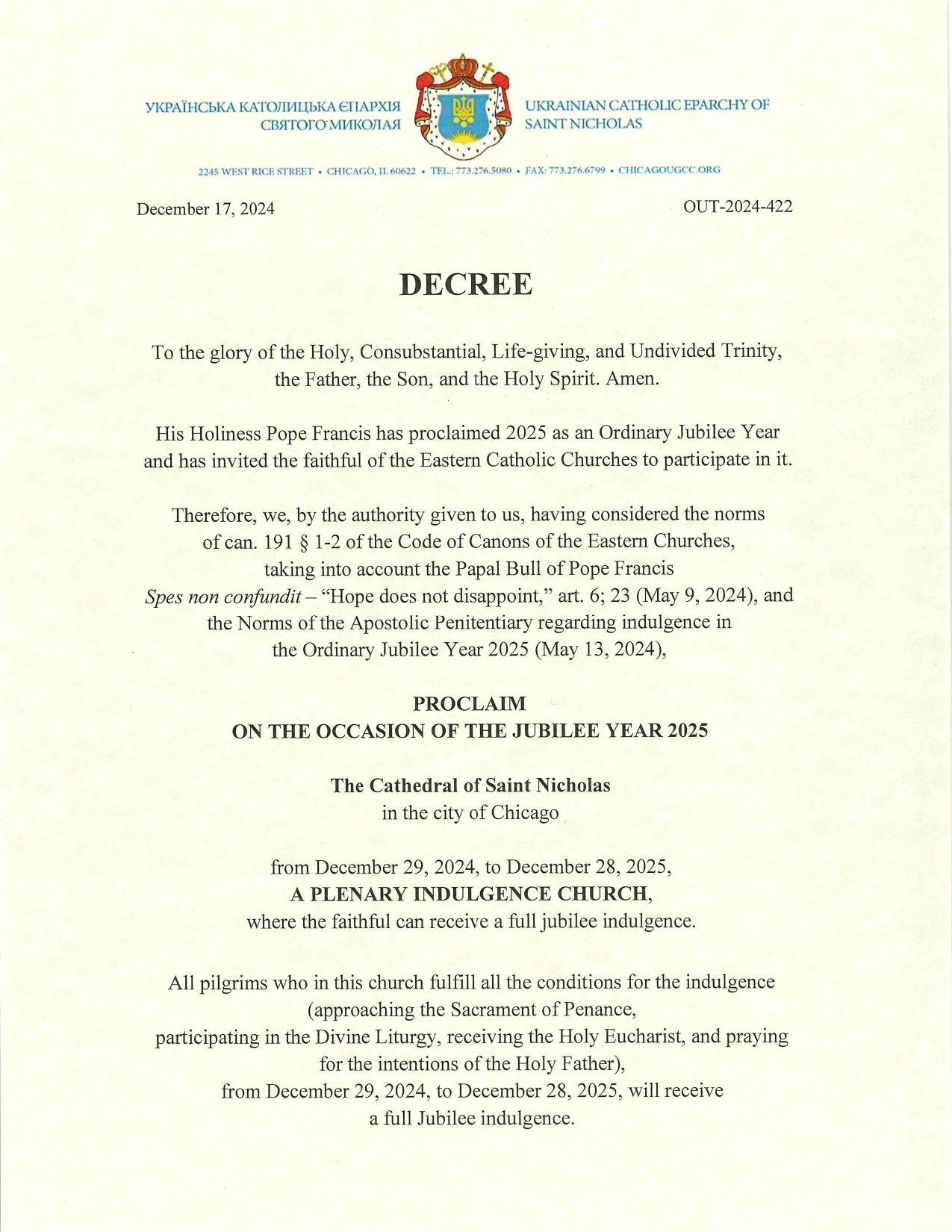 Jubilee year 2025 by Fr. Roman Bobesiuk December 24, 2024 December 24, 2024 201 views A+A- Reset 201 Share 0 FacebookTwitterTelegramSkypeViber You may also like Easter Pastoral Letter of His Beatitude Sviatoslav 2025 April 16, 2025 Easter Pastoral Letter of the Hierarchs in the... April 1, 2025 The Great Canon of St. Andrew of Crete March 1, 2025 The Sunday of the Veneration of the Holy... March 1, 2025 The Sunday of Orthodoxy March 1, 2025 Liturgy – Presanctified Gifts March 1, 2025 Which foods are allowed and which are not... February 26, 2025 All Souls Saturdays – Sorokousty February 26, 2025 Ceremony of Reconciliation February 26, 2025 A Certain Curtain February 26, 2025