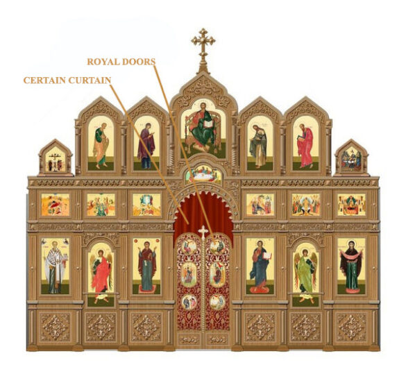 The Holy Hierarch Basil the Great in the second half of the fourth century was the first to have the Holy Place concealed by the closing of a veil. The veil that is drawn across the Royal Doors of the iconostas in our church is a representation of the veil that separated the Holy of Holies, a separate room, in the ancient Temple of the Jews in Jerusalem. Once a year, on Yom Kippur, the “Day of Atonement,” only the High Priest would enter the Holy of Holies and perform a special ceremony that symbolized the people’s repentance for the sins of the previous year and to entreat God’s forgiveness. Apostle Paul tells us that this ritual was a prophecy of the incarnation, death, and resurrection of our Lord.